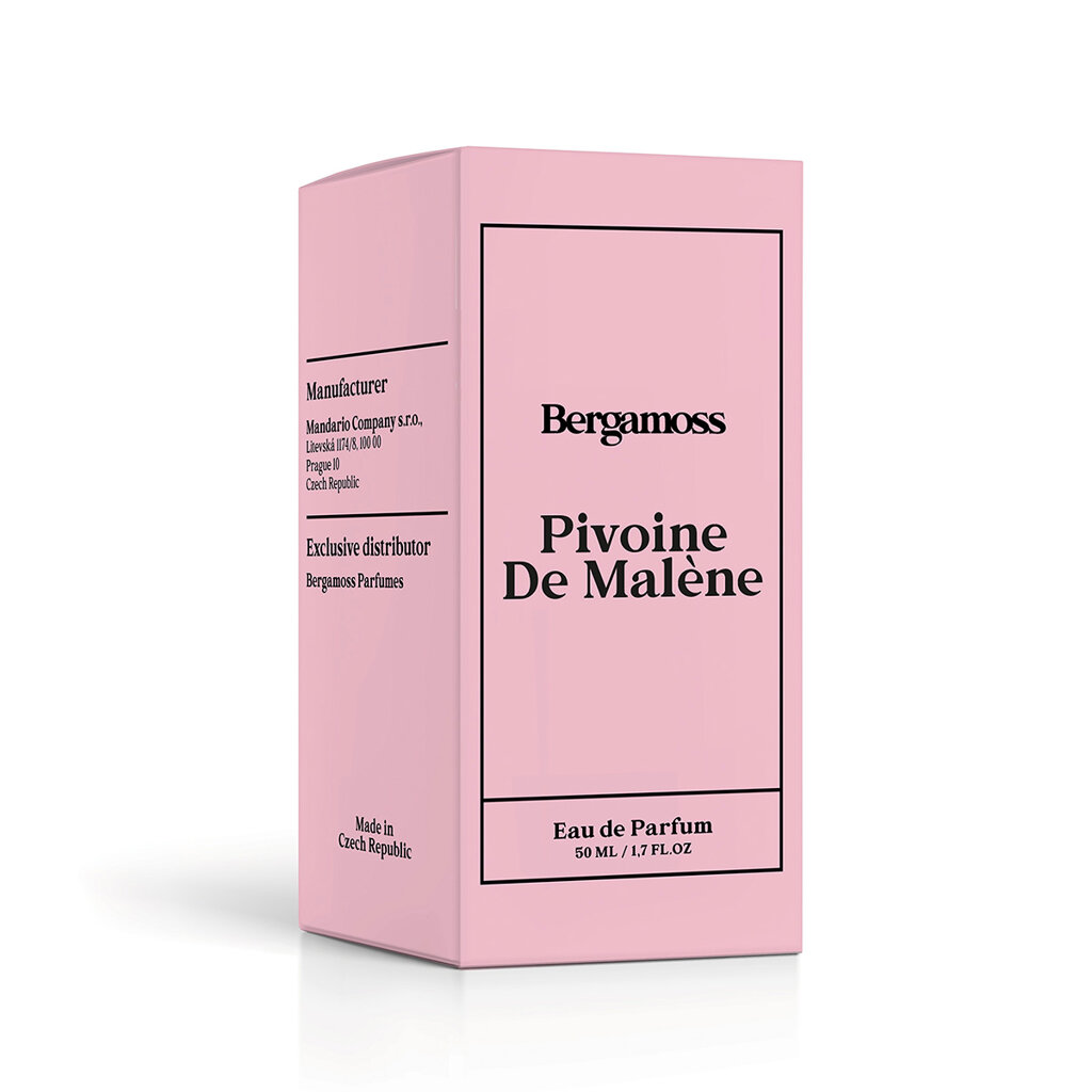 Pivoine de Malène de Bergamoss est un parfum pour femmes, lancé en 2025. Le parfumeur tchèque Václav Lebeda est à l'origine de cette innovation sophistiquée, créant un parfum inspiré par la beauté délicate des fleurs et l'air frais du matin sur le paysage méditerranéen. Le résultat est une composition élégante et fraîche qui célèbre la féminité dans sa forme la plus délicate.